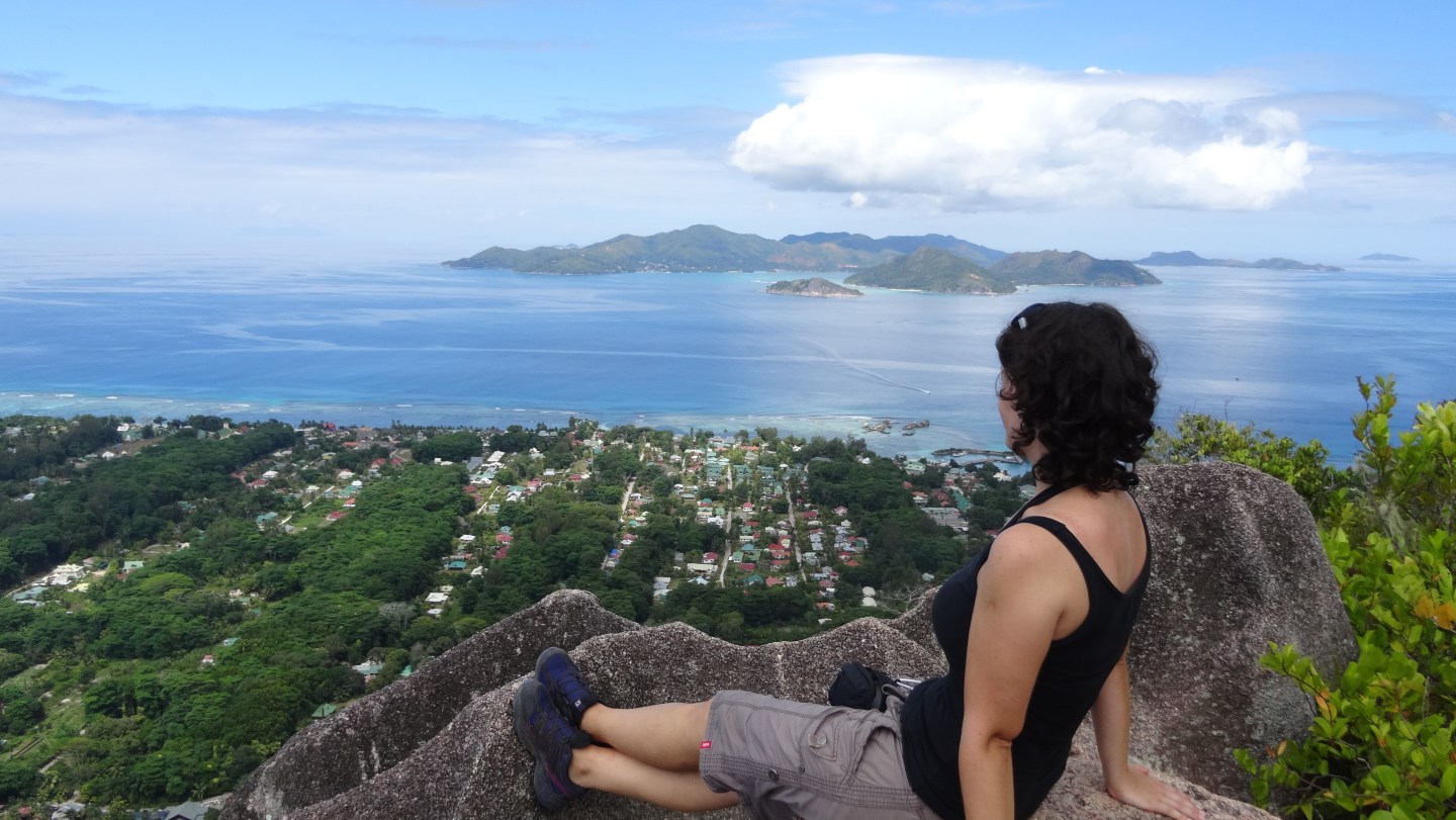 Nous sommes récompensés après environ une heure d’efforts par le point de vue au sommet qui nous offre un panorama grandiose sur l’archipel : on peut apercevoir « Praslin », « Curieuse » d’un côté, puis « Félicité », »Coco », »Grande Soeur » et « Petite Soeur » de l’autre.