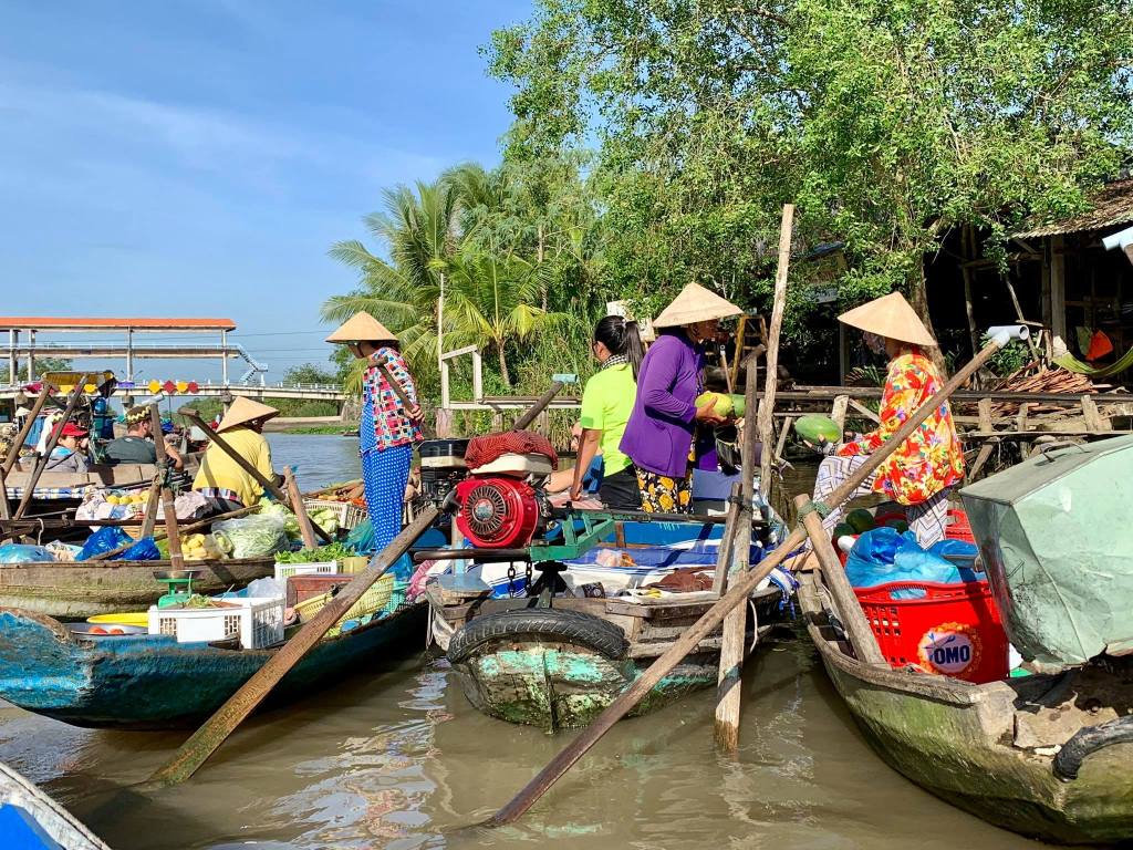 Un second marché flottant s’offre à nous : celui de Phong Dien, beaucoup plus petit mais plus sympathique, on peut même goûter aux pastèques, mangues et ananas avant de nous diriger vers les arroyos, un réseau énorme de petits canaux, un tout autre univers.