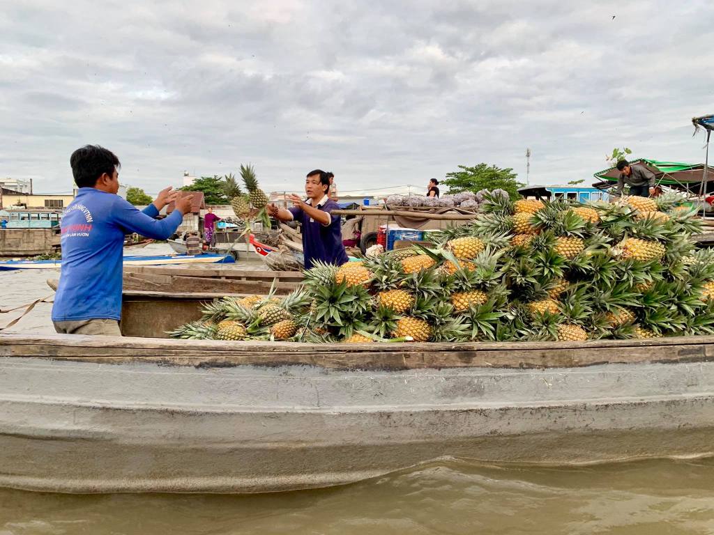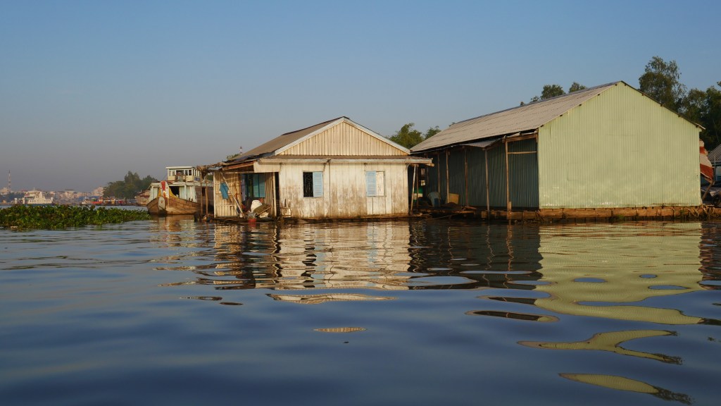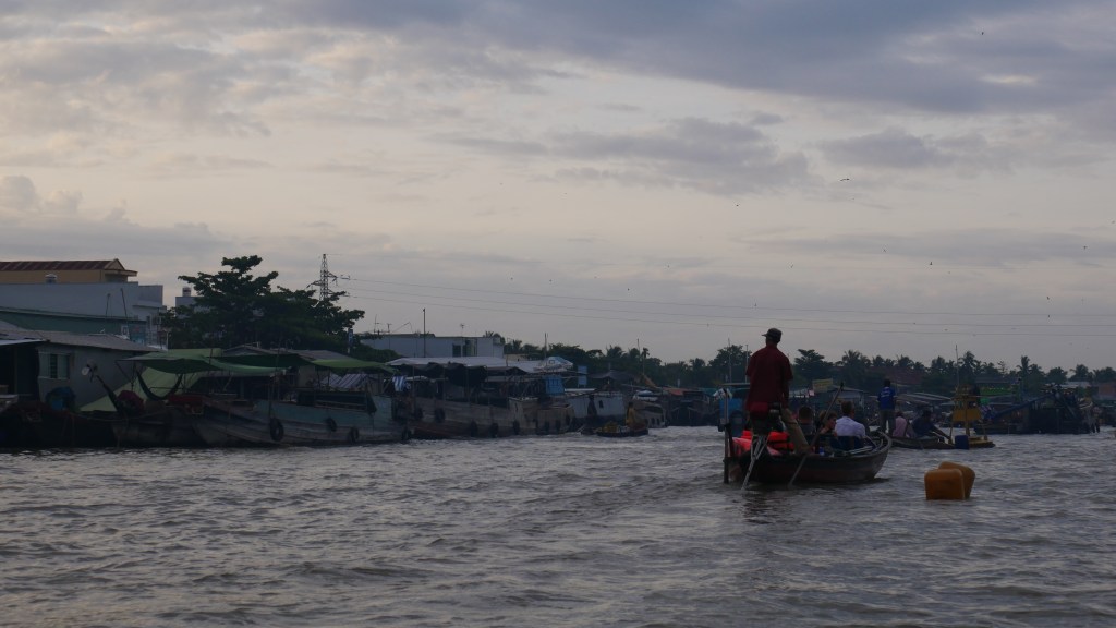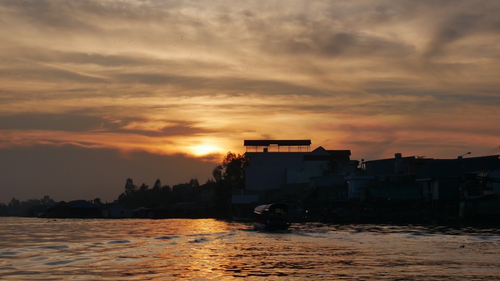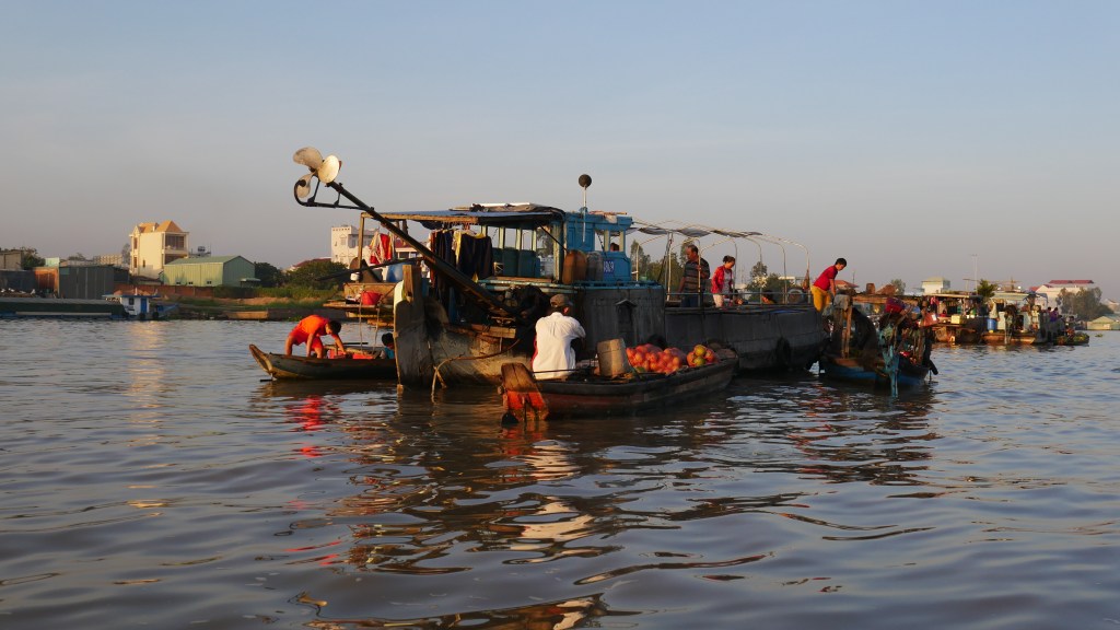 Le soleil se lève tout doucement sur le Mékong, et les maisons sur pilotis installées le long de ses berges. Nous arrivons sur le marché flottant, où de grands bateaux de grossistes approvisionnement de plus petits bateaux : ceux des marchands.