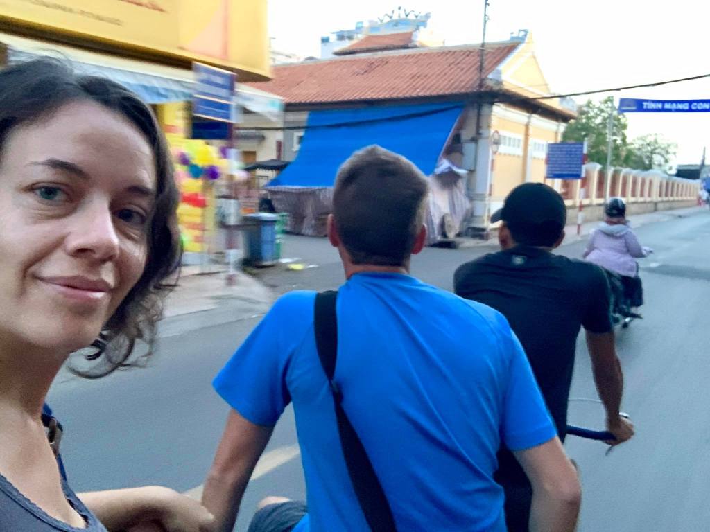 On nous dépose à l’entrée de la ville de Chau Doc, et nous devons finir à pied le trajet jusque l’hôtel ! Au Vietnam les bus ont tendance à déposer les touristes un peu n’importe où…