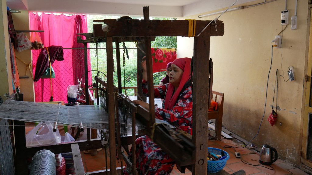 Le pilote ne parle pas bien anglais mais on se comprend quand même 😀 Il nous dépose dans un village Cham, nous prenons le temps de parcourir le village et un atelier de tissage.
