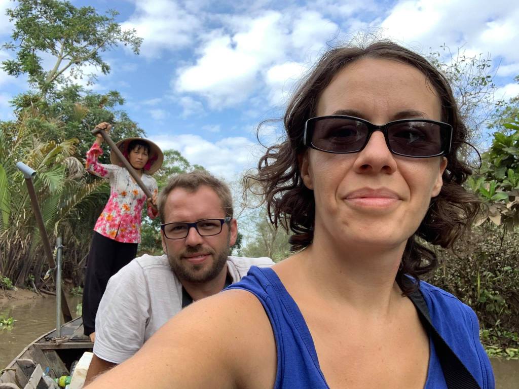 Ce matin le (jeune) grand-père de la famille nous emmène nous promener à Caï Bé une autre ville importante du Delta. En chemin nous changeons d’embarcation pour une petite barque qui nous emmène dans les petits canaux, les arroyos. Le niveau de l’eau est assez bas, et notre pilote a un peu de mal à se frayer un chemin et à faire avancer le bateau. Ici le phénomène des marées est présent et le marnage est assez fort et peut aller jusqu’à 2 mètres !