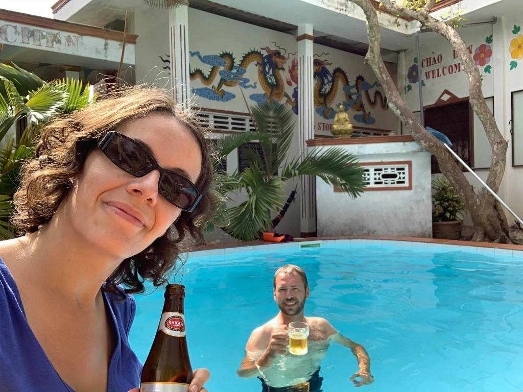 Autre point fort du logement : la piscine ! Nou s décidons d’opter pour une après-midi détente. Elle est suivie d’un bon repas en terrasse et d’un coucher de soleil incroyable sur le Mékong.