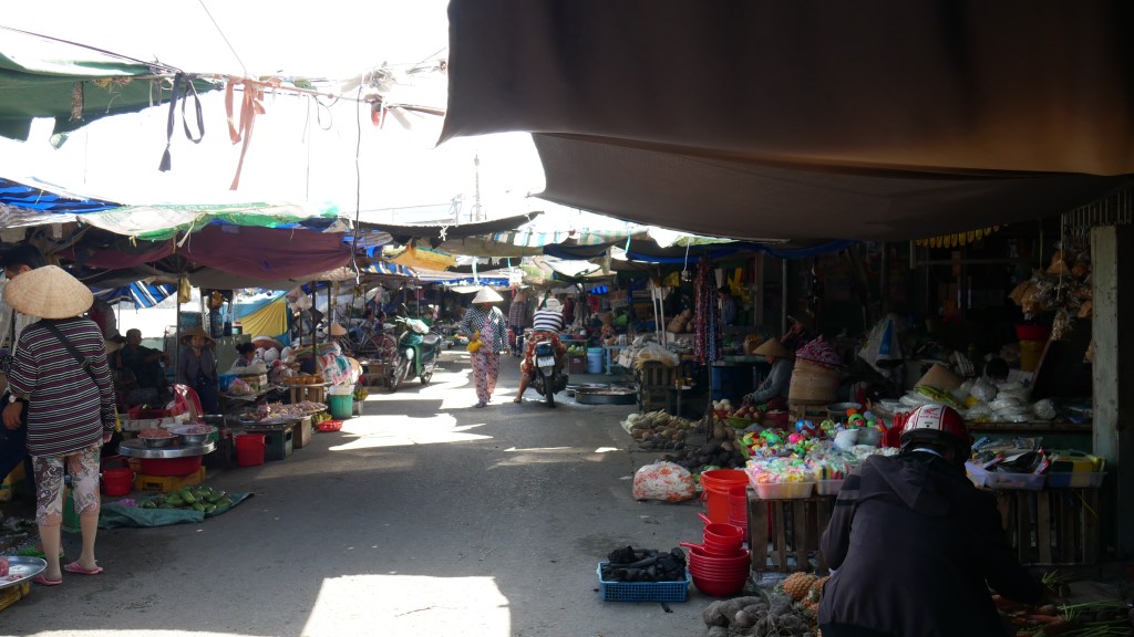 C’est peut être du fait de la marée basse et de l’heure à laquelle nous arrivons, que nous ne voyons que très peu d’activité sur le marché flottant de Caï Bé. Il paraît aussi que le marché est bien moins actif que ceux de Can Tho et Chau Doc.