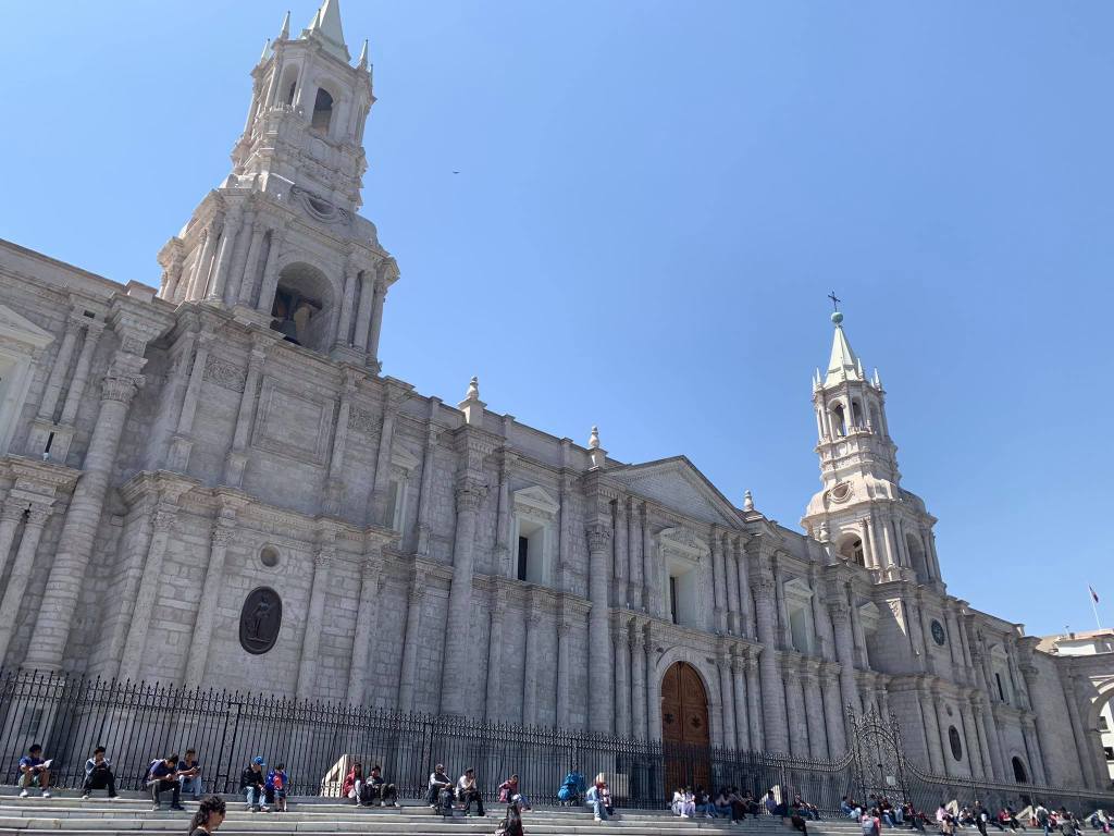 La Cathédrale qui occupe la place sur tout un côté, est la plus grande du Pérou. Construite en sillar blanc, une roche volcanique, nous avons la possibilité de la visiter avec une guide qui parle Français. Nous entrons dans la cathédrale, puis montons sur son toit et apprécions une vue incroyable sur la ville et les trois volcans : Le Misti, le Chachani et le Pichu Pichu.