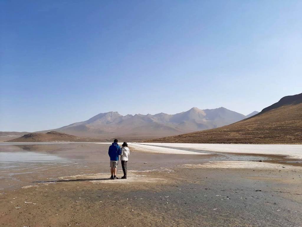 La Laguna de Salinas est située à l’est de la ville, c’est un lac perché à 4300m d’altitude, la hauteur de l’eau de celui-ci varie selon la période, lorsqu’il s’assèche il laisse apparaître une couche de sel, un type de paysage que nous n’avions jamais vu… On se sent seul au monde ! (et essoufflés avec l’altitude)