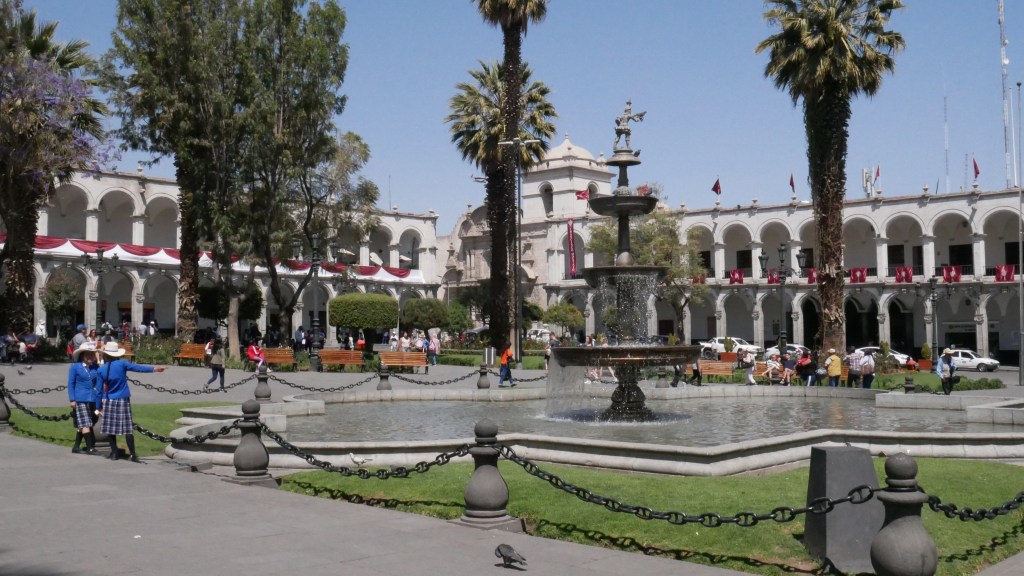Ce trajet en bus fût éprouvant, nous avons très peu dormi car nous avons été pas mal secoués, le bus a parcouru de nombreux lacets pour atteindre la ville et les 2000m d’altitude. A notre arrivée en tout début de matinée à notre logement le Vallecito Bacpackers, nous avons pu prendre une bonne douche pour nous requinquer et partir découvrir Arequipa.